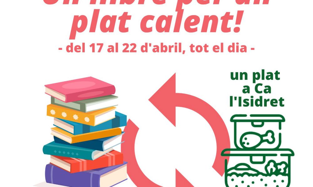 Aquest Sant Jordi, et proposem una iniciativa ben diferent: endu-te un llibre de segona ma de la nostra biblioteca (muntarem una paradeta!), deixa la teva aportació econòmica voluntària i col·labora amb un projecte del barri: Un plat calent de la cuina comunitària de Ca l’Isidret, en col·laboració amb el Pla Comunitari del Poblenou.