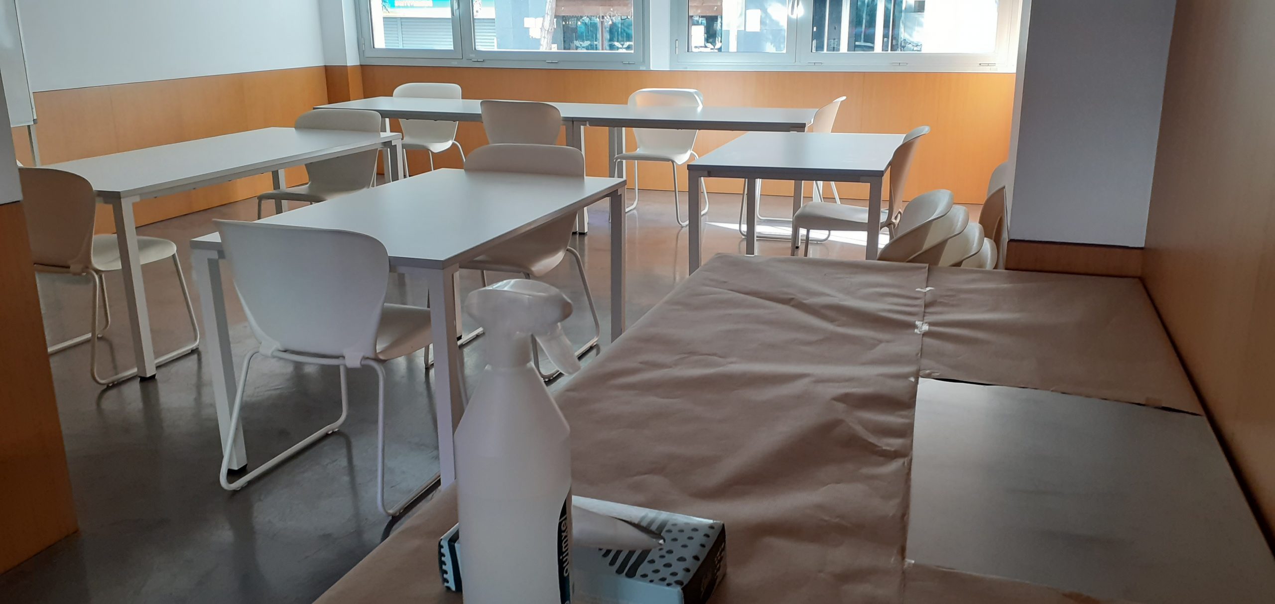 – Netejar taules i cadires amb un kit antibacterià que ens ha facilitat l’Ajuntament de Barcelona (trobareu un kit a cada sala per si voleu reforçar aquesta neteja)