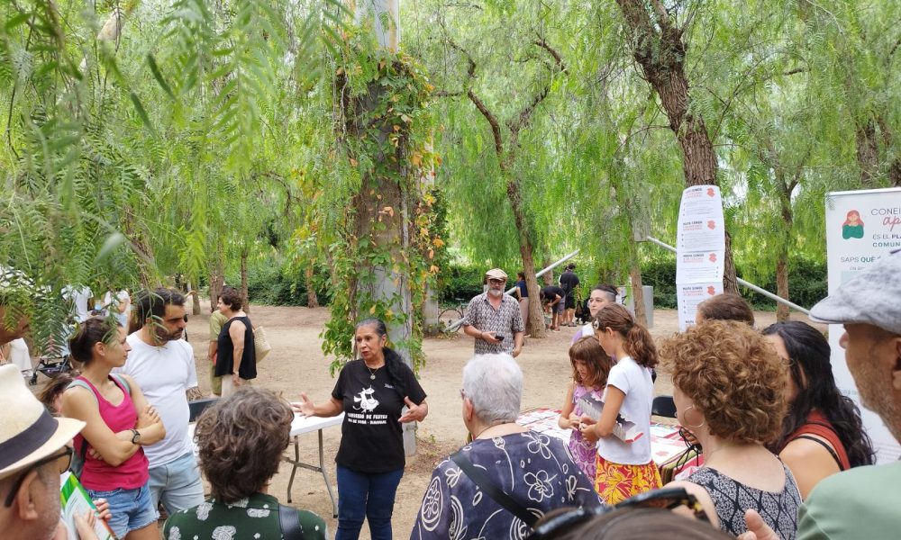 Durant el matí, es va fer un recorregut simbòlic pel parc amb la participació de 2 de les 10 veus que actualment conformen el mapa. La Nancy, de la Comissió de festes de Bac de Roda-Diagonal, va explicar que la comissió i la gent que la conforma, ha sigut per ella una veritable xarxa de suport mutu, la millor medicina en els moments més durs de la seva vida al barri, el desnonament pel que va passar.El seu testimoni subratlla el valor de les xarxes veïnals, el suport mutu i les festes com a eines de resistència i cohesió social davant l’especulació i la precarietat. La Gabriela, membre activa del grup de veïnes que gestionen col·lectivament un espai verd del barri, posa en relleu com El Jardín de las Mariposas s’ha convertit en un espai d’acollida, suport mutu i convivència intercultural i intergeneracional, així com en una eina d’activisme i transformació comunitària.